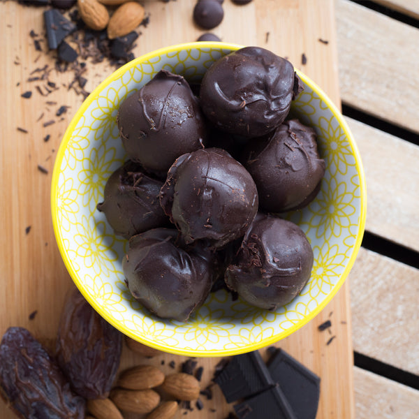 • Almond butter, dates, 70% Chocolate (Cocoa Mass, Sugar, Cocoa Butter, SOYA Lecitin, Vanilla Extract).