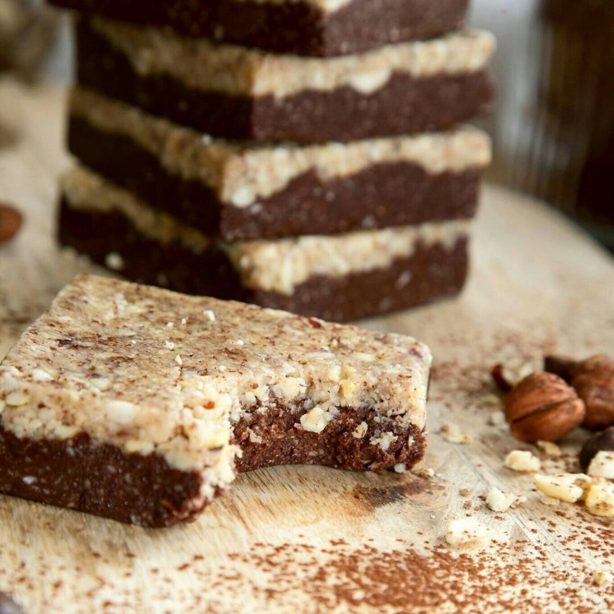 • A 'Choc Fudgy' Bottom Layer of Nuts and Almond Butter Topped with Crunchy Hazelnuts, Cashews and Organic Coconut Oil
